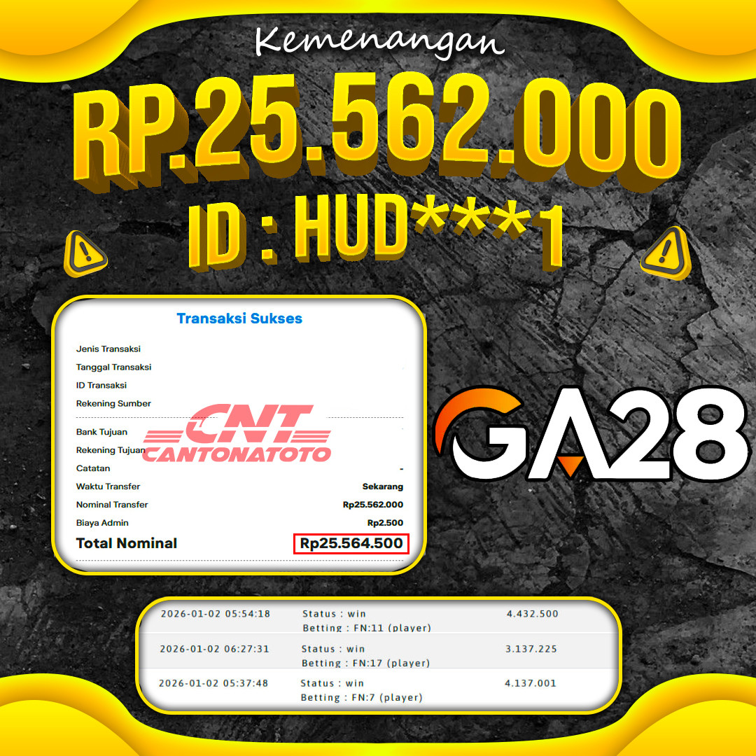 KETIKA KONSISTENSI BERTEMU MOMEN ✨ HASILNYA JADI PEMBEDA ???????? CLASSY DAN PUAS ???? ❤️SEL4M4T KEPADA M3MB3R S3TIA CANTONATOTO ????TANGGAL : 2 JANUARI 2026 ????USER ID : HUD***1 ????B0 : CNT ????M3N4NG : GA28 ????RP. 25.562.000 ???????????????????????? : https://rebrand.ly/daftarcantona