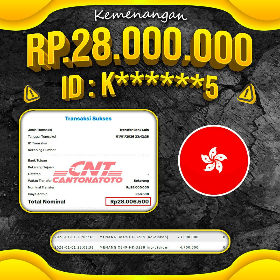 ANGKA DATANG DI SAAT YANG TEPAT ✨ MEMBUAT HARI INI TERASA LEBIH TENANG SEMOGA SELALU DIBERIKAN HAL-HAL TERBAIK ???????? ❤️SEL4M4T KEPADA M3MB3R S3TIA CANTONATOTO ????TANGGAL : 1 JANUARI 2026 ????USER ID : K******5 ????B0 : CNT ????M3N4NG : MENANG 3849-HK-3288 [no-diskon] ????RP. 28.000.000